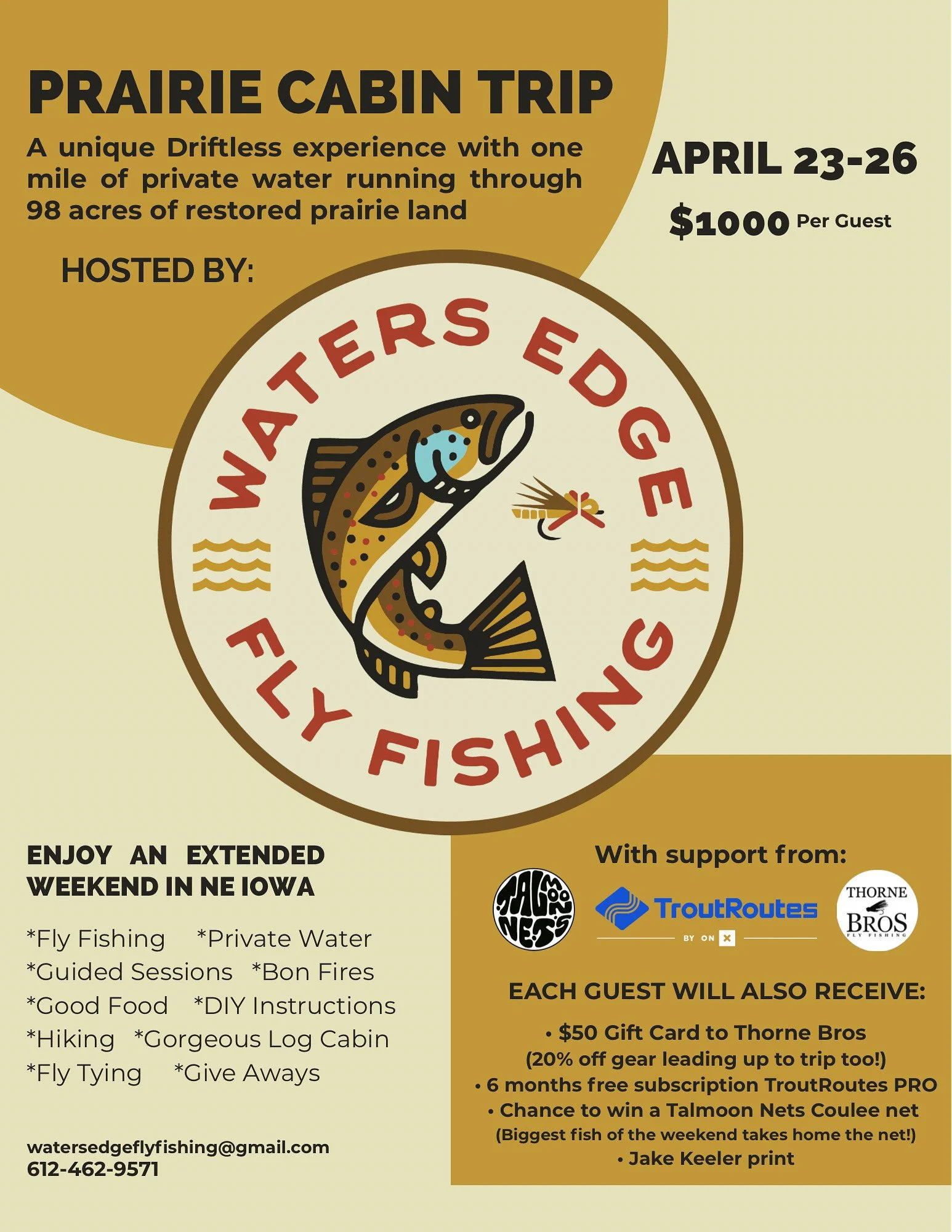 A custom built log home with a gourmet kitchen and beautiful living spaces situated yards away from over a mile of private water on 98 acres of restored prairie land. We will spend the weekend together fishing both the private water at the property and exploring nearby streams in the area. Most meals and activities are included with the potential to also branch off and explore on your own.